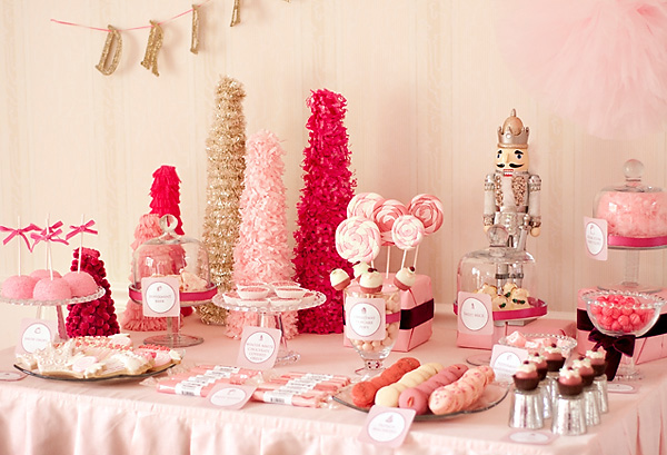 Why not have a December bridal shower in an all pink Nutcracker theme?  What a delightful display of everything girlie:  pink, glitter, bows and chocolate!